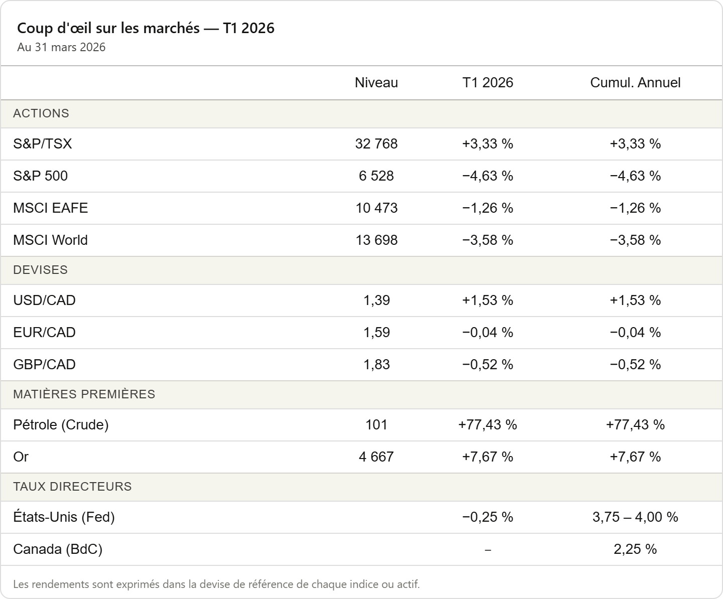 La caractéristique déterminante de ce trimestre est une rupture de corrélation. Nous assistons à une « re-régionalisation » de la performance. Le recul des indices américains a été alimenté non seulement par l’évolution des attentes en matière de taux d’intérêt, mais aussi par une correction dans le secteur technologique, qui avait atteint des niveaux de concentration historiquement élevés. Les allocations passives fortement pondérées dans ces secteurs font face à des vents contraires que la diversification géographique et sectorielle — spécifiquement l’énergie, les ressources et l’or — a permis de compenser.